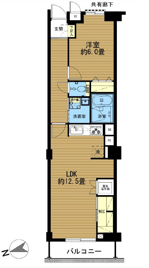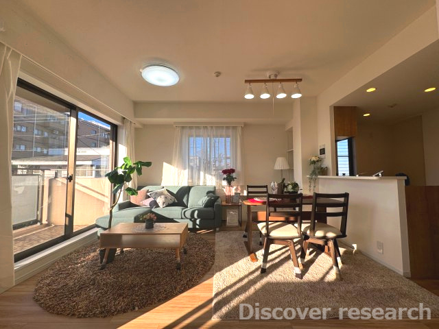 【居間・リビング】【LDK(約12.5帖)】 木目調のフローリングによって、LDKが温かみ・落ち着きのある空間になります。