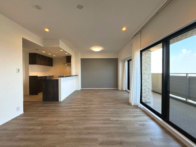 【居間・リビング】【LDK(約16.9帖)】 東向きで大きな窓のため、温かい自然光がリビングを照らします。 7階部分につき通風も良好です◎